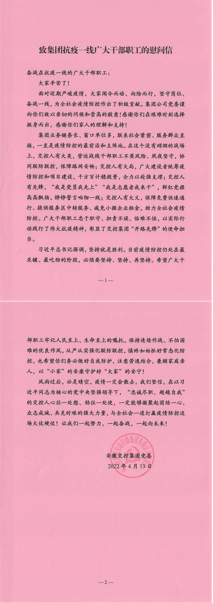 致集團抗疫一線廣大干部職工的慰問信