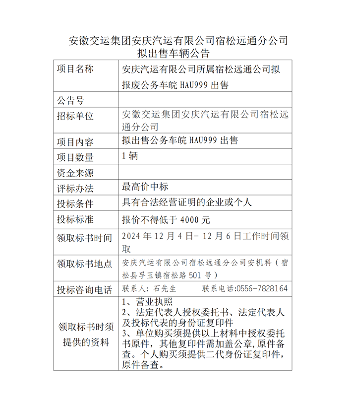 宿松遠通分公司擬出售車輛公告